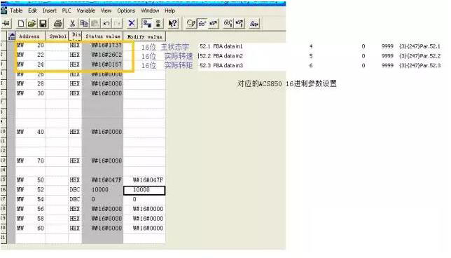 通常选择传输的数据是16位的, 该情况下PLC 侧的设置和ACS800 与ACS600的设置一样, 但是在ACS850中数据的传输选择16位的(或选择参数为16位的进行传输)。