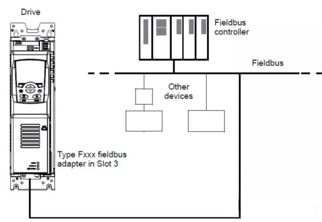 ACS850 Profibus_DP 通讯硬件结构拓扑图:硬件安装: 把FPBA-01插入ACS850 的SLOT3 ,(注意安插位置是否合适);插上之后上电,FPBA-01的指示灯HOST为绿灯,表示安装正确。